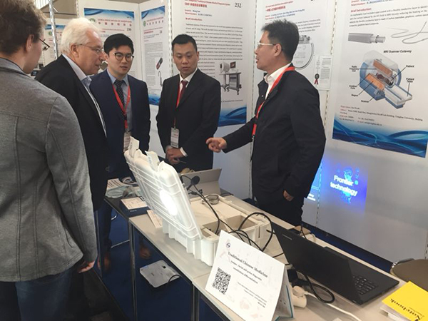 蕪湖圣美孚科技有限公司申報項目在順利通過國內(nèi)多重審查遴選后,成為中國中醫(yī)診療設(shè)備企業(yè)代表,作為中國代表團(tuán)成員參加了本次發(fā)明展。同時受邀參展的中國代表團(tuán)項目成員還有清華大學(xué)、北京交通大學(xué)、北京宇航系統(tǒng)工程研究所、中國航天科技集團(tuán)、國家電網(wǎng)公司等。11月2日展會開幕,中國駐德國大使館特派科技一秘李國強教授前來展會參觀中國代表團(tuán)并鼓勵。