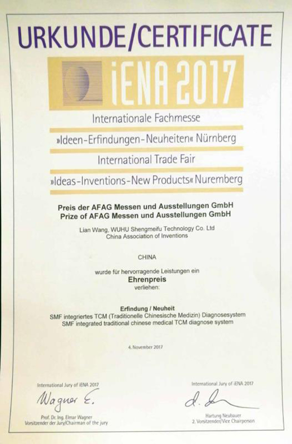 此次獲獎是公司繼榮獲科技部創(chuàng)新基金、國家高新技術(shù)企業(yè)、中醫(yī)診斷行業(yè)標(biāo)準(zhǔn)制定方、驗證方、首批入選“治未病服務(wù)適宜設(shè)備”、CE認(rèn)證等多項榮譽之后取得的國際性發(fā)明大獎,是我公司科研實力、綜合實力不斷提升的重要標(biāo)志。